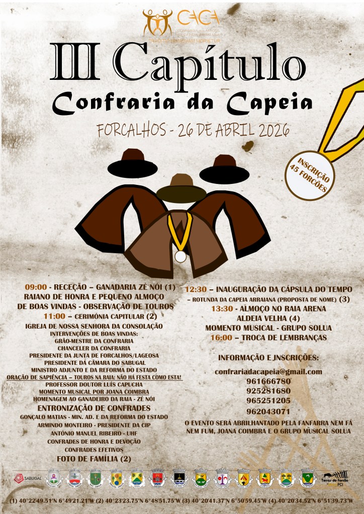 No próximo dia 26 de abril, domingo, a Confraria dos Amigos da Capeia Arraiana (CACA) vai reunir o seu capítulo geral de entronização. O evento decorre nas Terras do Forcão, concretamente na localidade de Forcalhos. A receção aos participantes será junto à ganadaria do ganadeiro da Raia, Zé Nói, realizando-se a cerimónia capitular na Capela de Nossa Senhora da Consolação, naquela localidade, a escassos metros da fronteira com Espanha.